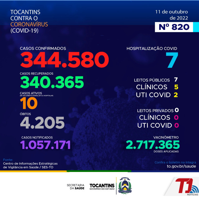O boletim epidemiológico nº 820 informa que 7 pessoas estão hospitalizadas no Tocantins. Deste total, 7 estão em leitos públicos, sendo 5 em leitos clínicos e outros 2 em UTIs Covid. Já nos leitos privados, são 0 em clínicos e 0 em UTIs Covid.