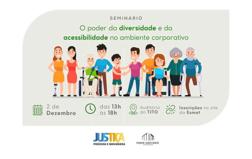 Em comemoração ao Dia Internacional da Pessoa com Deficiência, o Poder Judiciário do Tocantins (PJTO) e a Comissão Permanente de Acessibilidade e Inclusão (CPAI) realizam nesta segunda-feira, dia 2 de dezembro, o seminário “O Poder da Diversidade e da Acessibilidade no Ambiente Corporativo”, no auditório do Tribunal de Justiça (TJTO), com transmissão ao vivo pela plataforma virtual da Escola Superior da Magistratura (Esmat).