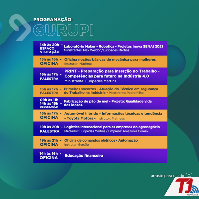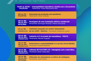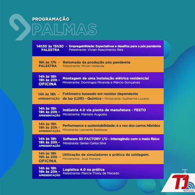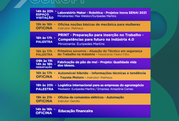 Na escola do Senai de Palmas, os visitantes poderão participar, entre outras atividades, da oficina de montagem de uma instalação elétrica residencial, além de saber mais sobre a performance e sustentabilidades dos modelos de carros híbridos. Ainda em Palmas, na escola de Taquaralto, além da apresentação da estrutura e laboratórios, serão trabalhados temas como internet das coisas e o uso de tecnologias para a busca por vagas de trabalho.