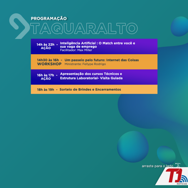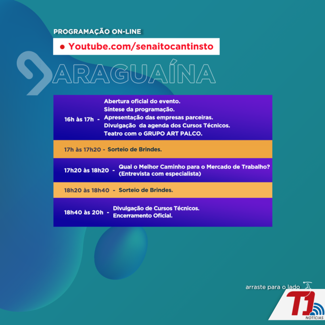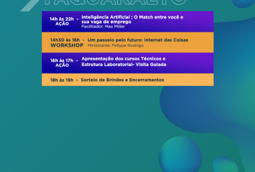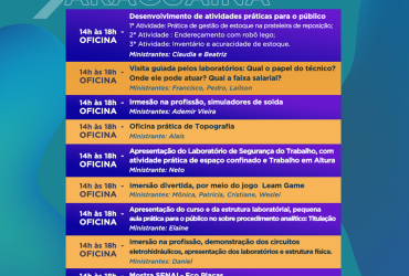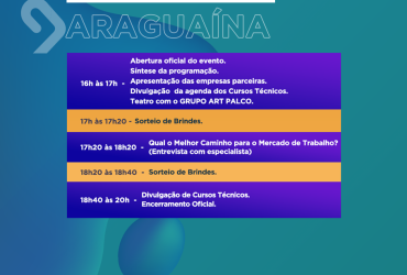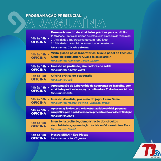 A escola de Araguaína será a responsável pela programação on-line do evento no Tocantins que inicia às 16h canal do Youtube e vai até às 20h com temas como a entrevista com especialista para falar sobre qual o melhor caminho para o mercado de trabalho. Além disso, nas atividades presenciais de Araguaína destacam-se a oficina prática de topografia, simuladores de solda e apresentação da estrutura, laboratórios e cursos oferecidos.