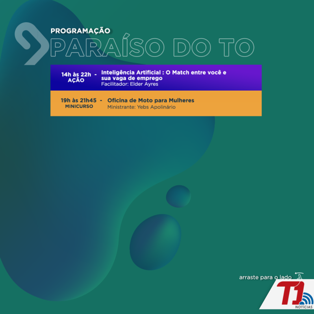 Em Paraíso, destaca-se a oficina de moto para mulheres no período noturno. No sul do estado, em Gurupi, os visitantes da escola poderão participar de palestra sobre primeiros socorros, da oficina de comandos elétricos – automação e de noções básicas de mecânica para mulheres.