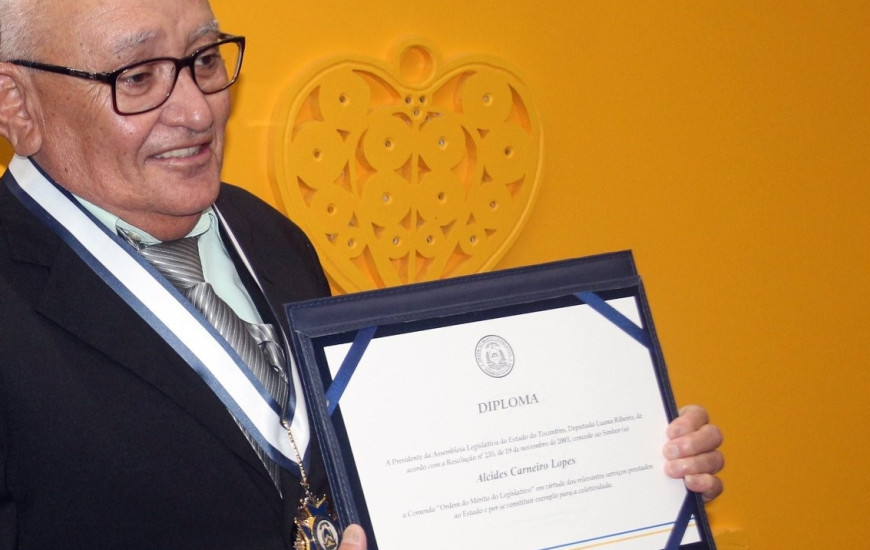 Servidor público pioneiro na Assembleia Legislativa, onde trabalhou por quase 30 anos, Seu Alcides recebeu, das minhas mãos, em 2018, a Comenda Ordem do Mérito do Legislativo, uma homenagem por sua contribuição para o desenvolvimento e fortalecimento do Tocantins.