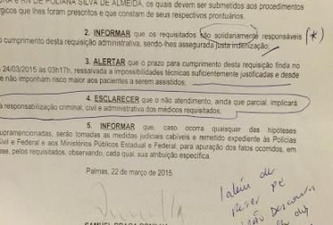 Na peça, o Ministério Público Estadual argumenta que os profissionais médicos do Hospital Dona Regina se recusam a cumprir escala de plantões determinada pela gestão hospitalar. Com base no argumento, o juiz determina que o Estado do Tocantins promova as condições de atendimento aos bebês, sob pena de multa diária de R$ 500,00 até o limite de R$ 100 mil reais.