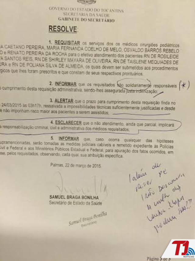 Uma portaria datada deste domingo, 22, assinada pelo secretário de Saúde do Estado, Samuel Bonilha está determinando que quatro cirurgiões pediatras atendam seis recém-nascidos em procedimentos cirúrgicos sob pena de responsabilizá-los civil e criminalmente caso deixem de atender mesmo que parcialmente a determinação.