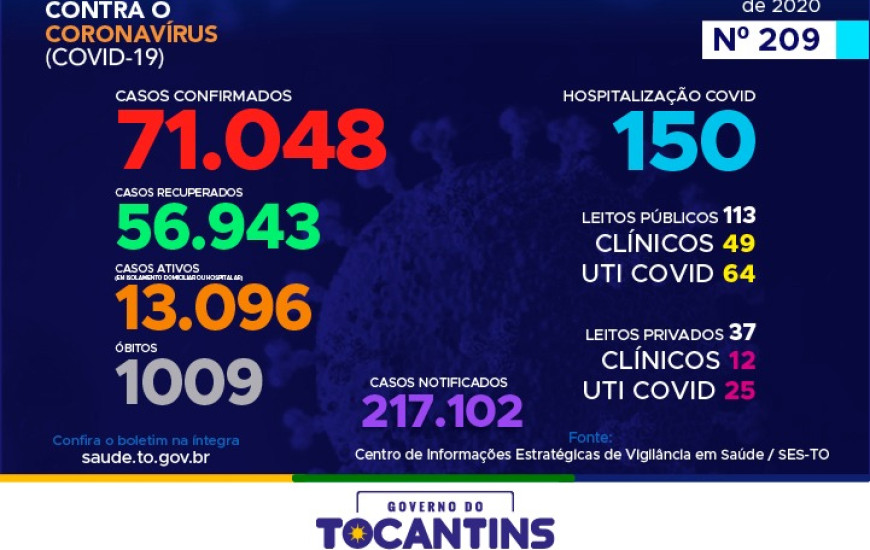 Desta forma, hoje o estado soma 217.102 pessoas notificadas com a Covid-19 e acumula 71.048 casos confirmados. Destes, 56.943 pacientes estão recuperados, 13.096 pacientes seguem em isolamento domiciliar ou hospitalar e 1.009 pacientes foram a óbito.