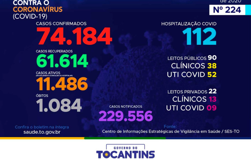 Desta forma, hoje o estado soma 229.556 pessoas notificadas com a Covid-19 e acumula 74.184 casos confirmados. Destes, 61.614 pacientes estão recuperados, 11.486 pacientes seguem em isolamento domiciliar ou hospitalar e 1.084 pacientes foram a óbito.