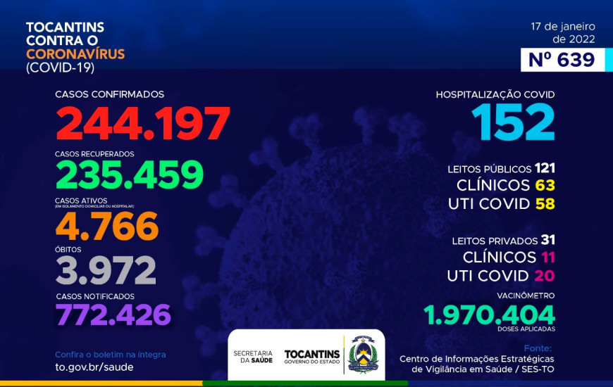 Também foram registrados mais cinco óbitos. As mortes aconteceram entre os dias 19 de novembro de 2021 e 04 de janeiro de 2022. As vítimas residiam em Porto Nacional, Araguaína, Pugmil e Buriti do Tocantins e tinham entre 37 e 78 anos.