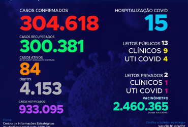 Com os novos dados, atualmente o Estado contabiliza 933.095 pessoas notificadas com a Covid-19 e acumula 304.618 casos confirmados. Destes 300.381 estão recuperados, 84 pacientes seguem em isolamento domiciliar ou hospitalar e 4.153 foram a óbito.
