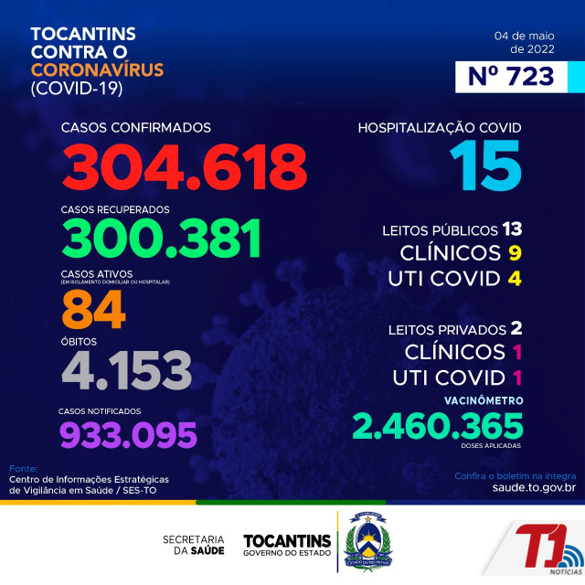 O boletim epidemiológico nº 723 informa que 15 pessoas estão hospitalizadas no Tocantins. Deste total, 13 estão em leitos públicos, sendo 9 em leitos clínicos e outros 4 em UTIs Covid. Já nos leitos privados, são 1 em clínicos e 1 em UTIs Covid, totalizando 2.