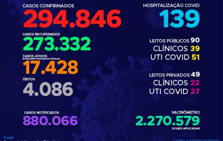 Com os novos dados, atualmente o Estado contabiliza 880.066 pessoas notificadas com a Covid-19 e acumula 294.846 casos confirmados. Destes, 273.332 estão recuperados, 17.428 pacientes seguem em isolamento domiciliar ou hospitalar e 4.086 foram a óbito.