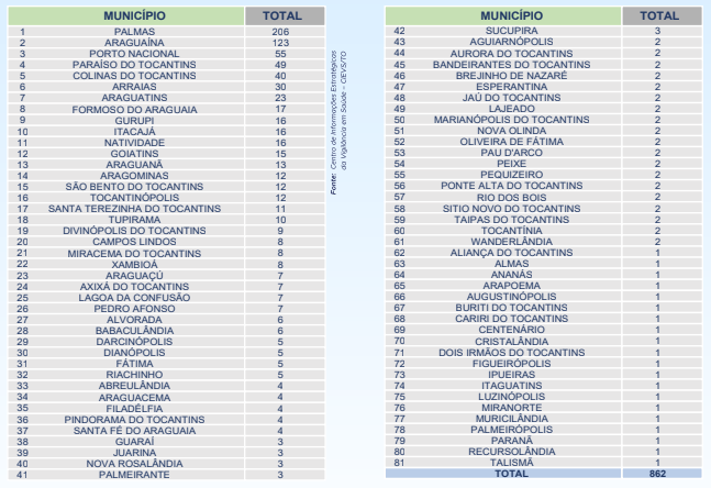 Conforme o boletim epidemiológico nº 172, com os novos dados, hoje o Tocantins acumula 52.938 casos confirmados, sendo que 35.023 pacientes estão recuperados, 17.203 estão ainda ativos (em isolamento domiciliar ou hospitalar) e 712 pessoas morreram vítimas da doença.