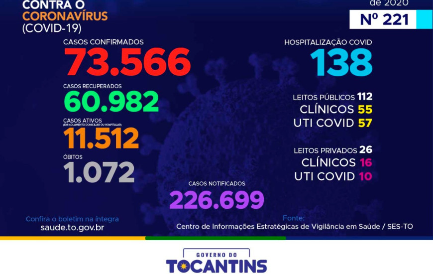 Desta forma, hoje o estado soma 226.699 pessoas notificadas com a Covid-19 e acumula 73.566 casos confirmados. Destes, 60.982 pacientes estão recuperados, 11.512 pacientes seguem em isolamento domiciliar ou hospitalar e 1.072 pacientes foram a óbito.