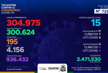 O boletim epidemiológico nº 729 informa que 15 pessoas estão hospitalizadas no Tocantins. Deste total, 11 estão em leitos públicos, sendo 7 em leitos clínicos e outros 4 em UTIs Covid. Já nos leitos privados, são 0 em clínicos e 4 em UTIs Covid, totalizando 4.