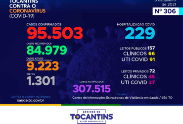 Desta forma, hoje o estado soma 307.515 pessoas notificadas com a Covid-19 e acumula 95.503 casos confirmados. Destes, 84.979 pacientes estão recuperados, 9.223 pacientes seguem em isolamento domiciliar ou hospitalar e 1.301 pacientes foram a óbito.
