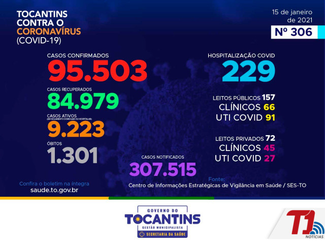 Nesta sexta-feira, 15 de janeiro, o Tocantins contabilizou 576 novos casos de Covid-19. Deste total, 117 foram registrados nas últimas 24 horas e o restante por exames coletados em dias anteriores e que tiveram seus resultados liberados na data de ontem. Dos novos casos, 341 foram detectados por RT-PCR, 63 por sorologia e 172 através de testes rápidos.