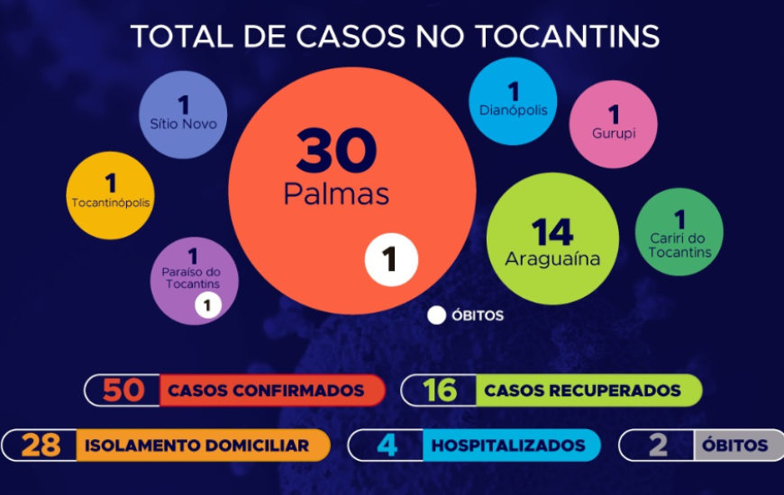Desta forma, o Tocantins agora contabiliza 50 casos confirmados da Covid-19, nas cidades de Palmas (30), Araguaína (14), Cariri do Tocantins (01), Gurupi (01), Dianópolis (01), Paraíso do Tocantins (01), Sítio Novo (01) e Tocantinópolis (01). Atualmente, o Tocantins apresenta 02 óbitos, 16 pacientes estão recuperados e dispensados do isolamento, 28 pacientes ainda em isolamento domiciliar e 04 pacientes estão internados (03 rede pública e 01 rede privada).