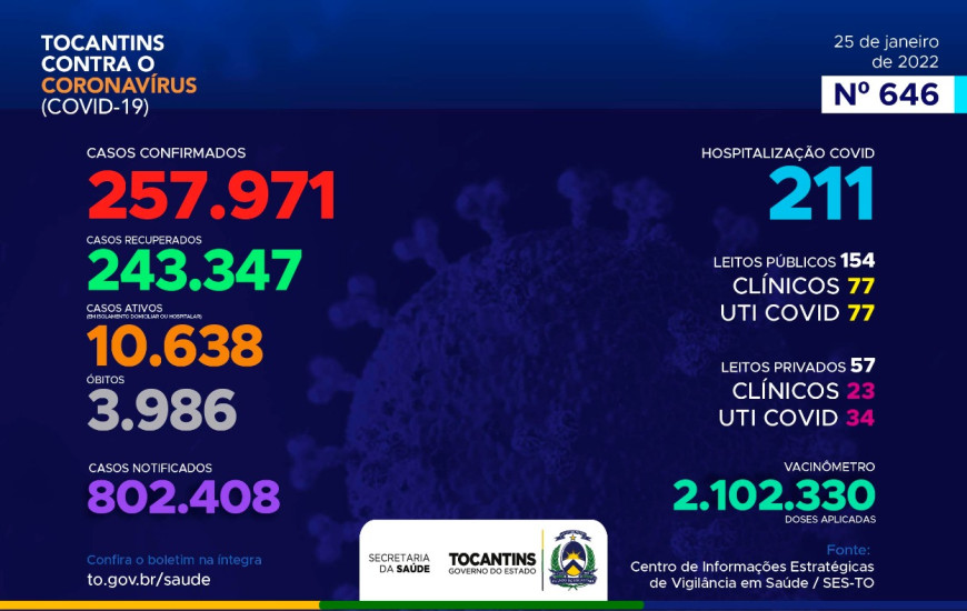 O boletim epidemiológico nº 646 informa que 211 pessoas estão hospitalizadas no Tocantins. Deste total, 154 estão em leitos públicos, sendo 77 em leitos clínicos e outros 77 em UTIs Covid. Já nos leitos privados, são 23 em clínicos e 34 em UTIs Covid, totalizando 57.