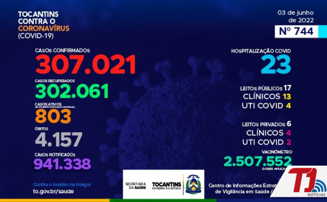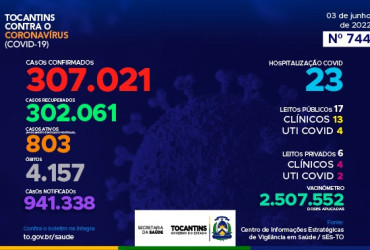 O boletim epidemiológico nº 744 informa que 23 pessoas estão hospitalizadas no Tocantins. Deste total, 17 estão em leitos públicos, sendo 13 em leitos clínicos e outros 4 em UTIs Covid. Já nos leitos privados, são 4 em clínicos e 2 em UTIs Covid, totalizando 6.