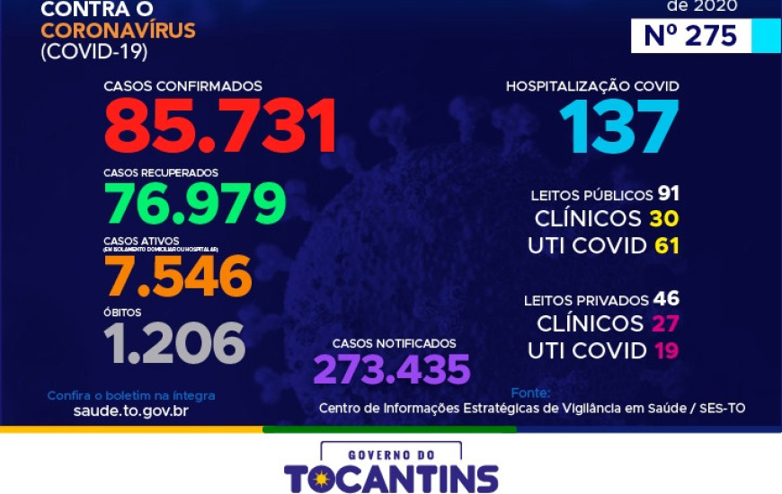 Desta forma, hoje o estado soma 273.435 pessoas notificadas com a Covid-19 e acumula 85.731 casos confirmados. Destes, 76.979 pacientes estão recuperados, 7.546 pacientes seguem em isolamento domiciliar ou hospitalar e 1.206 pacientes foram a óbito.