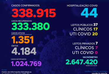 Com os novos dados, atualmente o Estado contabiliza 1.024.769 pessoas notificadas com a Covid-19 e acumula 338.915 casos confirmados. Destes 333.380 estão recuperados, 1.351 pacientes seguem em isolamento domiciliar ou hospitalar e 4.184 foram a óbito.