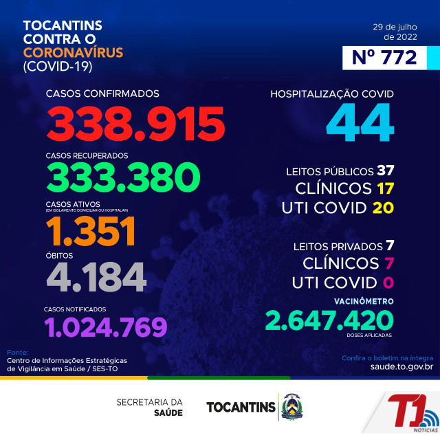 O boletim epidemiológico nº 772 informa que 44 pessoas estão hospitalizadas no Tocantins. Deste total, 37 estão em leitos públicos, sendo 17 em leitos clínicos e outros 20 em UTIs Covid. Já nos leitos privados, são 7 em clínicos e 0 em UTIs Covid, totalizando 7.