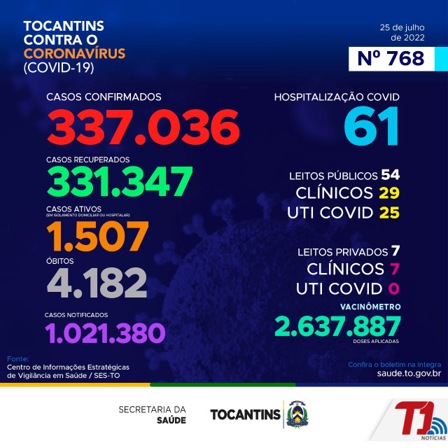 O boletim epidemiológico nº 768 informa que 61 pessoas estão hospitalizadas no Tocantins. Deste total, 54 estão em leitos públicos, sendo 29 em leitos clínicos e outros 25 em UTIs Covid. Já nos leitos privados, são 7 em clínicos e 0 em UTIs Covid, totalizando 7.
