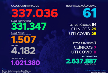 Com os novos dados, atualmente o Estado contabiliza 1.021.380 pessoas notificadas com a Covid-19 e acumula 337.036 casos confirmados. Destes 331.347 estão recuperados, 1.507 pacientes seguem em isolamento domiciliar ou hospitalar e 4.182 foram a óbito.