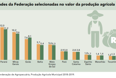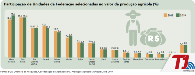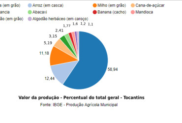 Considerando-se as 27 Unidades da Federação, o Estado ocupa a 13ª posição no ranking de valor da produção total do país, ficando à frente dos demais estados da Região Norte. Com destaque para a soja e o arroz, em 2018 a participação tocantinense ficou com a fatia de apenas 1,2% e no ano passado apresentou expansão de 1 ponto percentual, chegando a 1,3%.