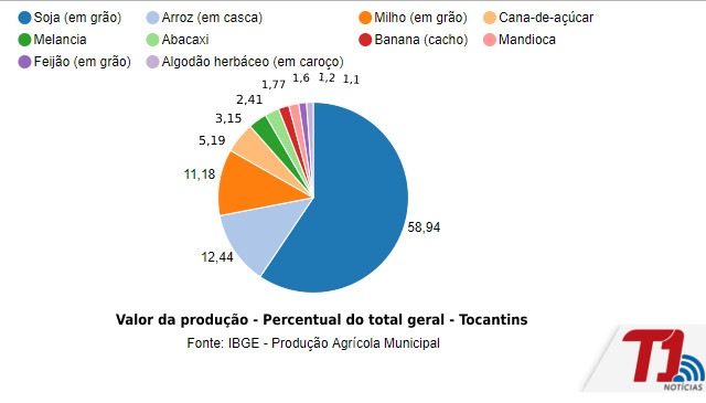 No ranking das culturas que mais geram valor à produção no Tocantins, a soja mais figurou na primeira posição do ranking, integrando uma fatia de mais da metade do total do valor de produção do estado (58,94%). Na sequência, aparecem o arroz em casca (12,4%), o milho (12,44%) e a cana-de-açúcar (11,18%).