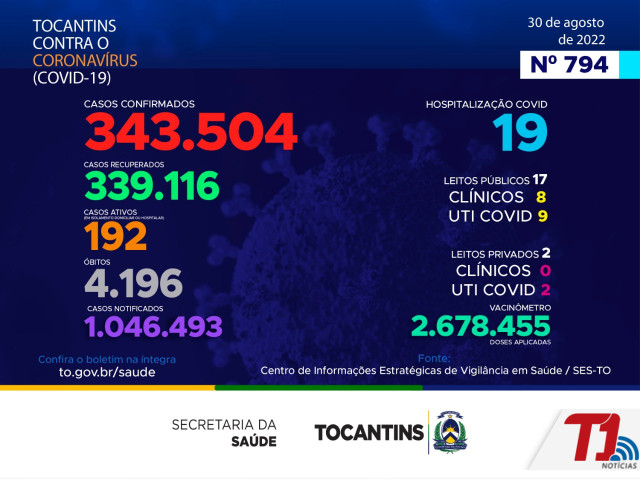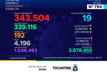 O boletim epidemiológico nº 794 informa que 19 pessoas estão hospitalizadas no Tocantins. Deste total, 17 estão em leitos públicos, sendo 8 em leitos clínicos e outros 9 em UTIs Covid. Já nos leitos privados, são 0 em clínicos e 2 em UTIs Covid.
