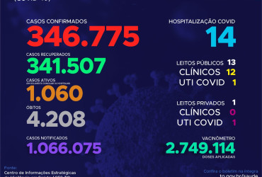 Com os novos dados, atualmente o Estado contabiliza 1.066.075 pessoas notificadas com a Covid-19 acumula 346.775 casos confirmados. Destes, 341.507 estão recuperados, 1.060 pacientes seguem em isolamento domiciliar ou hospitalar e 4.208 foram a óbito.
