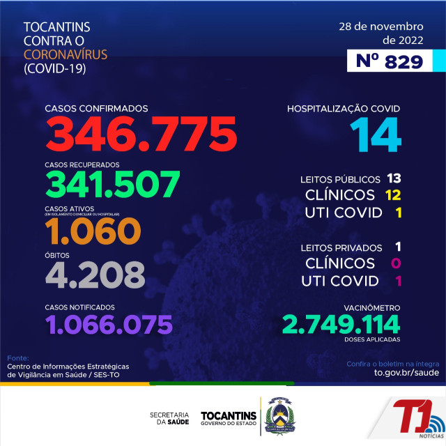 O boletim epidemiológico nº 829 informa que 14 pessoas estão hospitalizadas no Tocantins. Deste total, 13 estão em leitos públicos, sendo 12 em leitos clínicos e outros 1 em UTIs Covid. Já nos leitos privados, são 0 em clínicos e 1 em UTIs Covid.