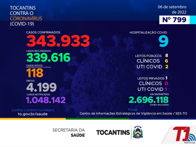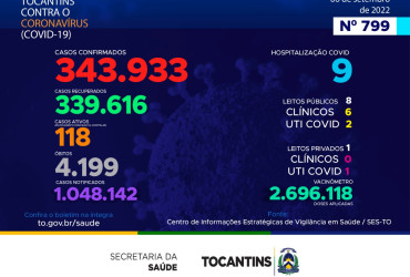 O boletim epidemiológico nº 799 informa que 9 pessoas estão hospitalizadas no Tocantins. Deste total, 8 estão em leitos públicos, sendo 6 em leitos clínicos e outros 2 em UTIs Covid. Já nos leitos privados, são 0 em clínicos e 1 em UTIs Covid.