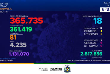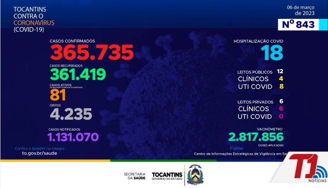 O boletim epidemiológico nº 843 informa que 18 pessoas estão hospitalizadas no Tocantins. Deste total, 12 estão em leitos públicos, sendo 4 em leitos clínicos e outros 8 em UTIs Covid. Já nos leitos privados, são 6 em clínicos e 0 em UTIs Covid.