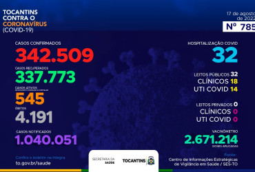 O boletim epidemiológico nº 785 informa que 32 pessoas estão hospitalizadas no Tocantins. Deste total, 32 estão em leitos públicos, sendo 18 em leitos clínicos e outros 14 em UTIs Covid. Já nos leitos privados, são 0 em clínicos e 0 em UTIs Covid.