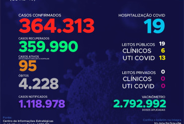 Com os novos dados, atualmente o Estado contabiliza 1.118.978 pessoas notificadas com a Covid-19 acumula 364.313 casos confirmados. Destes 359.990 estão recuperados, 95 pacientes seguem em isolamento domiciliar ou hospitalar e 4.228 foram a óbito.