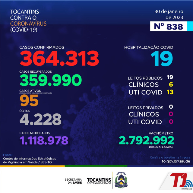 O boletim epidemiológico nº 838 informa que 19 pessoas estão hospitalizadas no Tocantins. Deste total, 19 estão em leitos públicos, sendo 6 em leitos clínicos e outros 13 em UTIs Covid. Já nos leitos privados, são 0 em clínicos e 0 em UTIs Covid.