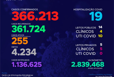 Com os novos dados, atualmente o Estado contabiliza 1.136.625 pessoas notificadas com a Covid-19 acumula 366.213 casos confirmados. Destes, 361.724 estão recuperados, 255 pacientes seguem em isolamento domiciliar ou hospitalar e 4.234 foram a óbito.