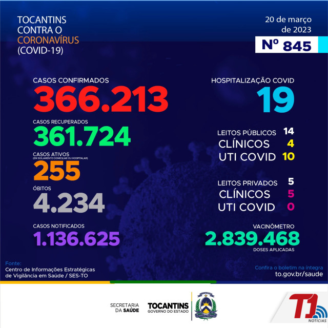 O boletim epidemiológico desta segunda-feira, 20 de março, contabilizou 327 novos casos de Covid-19 no Tocantins, sendo 1 das últimas 24 horas. O restante são de exames coletados em dias anteriores e que tiveram seus resultados inseridos no sistema pelos municípios.