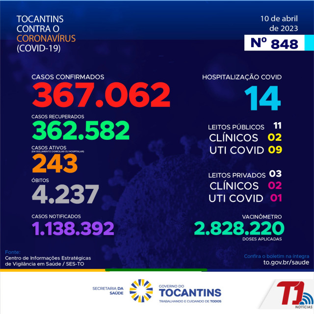 O boletim epidemiológico nº 848 informa que 14 pessoas estão hospitalizadas no Tocantins. Deste total, 11 estão em leitos públicos, sendo 02 em leitos clínicos e outros 09 em UTIs Covid. Já nos leitos privados, são 02 em clínicos e 01 em UTIs Covid.