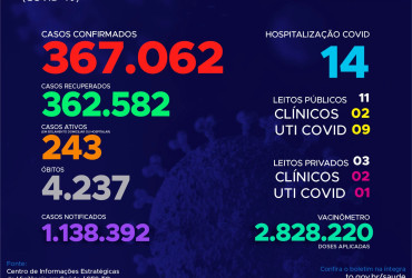 Com os novos dados, atualmente o Estado contabiliza 1.138.392 pessoas notificadas com a Covid-19 acumula 367.062 casos confirmados. Destes 362.582 estão recuperados, 243 pacientes seguem em isolamento domiciliar ou hospitalar e 4.237 foram a óbito.