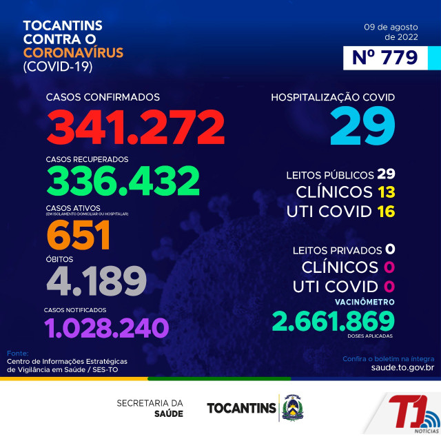O boletim epidemiológico nº 779 informa que 29 pessoas estão hospitalizadas no Tocantins. Deste total, 29 estão em leitos públicos, sendo 13 em leitos clínicos e outros 16 em UTIs Covid. Já nos leitos privados, são 0 em clínicos e 0 em UTIs Covid.