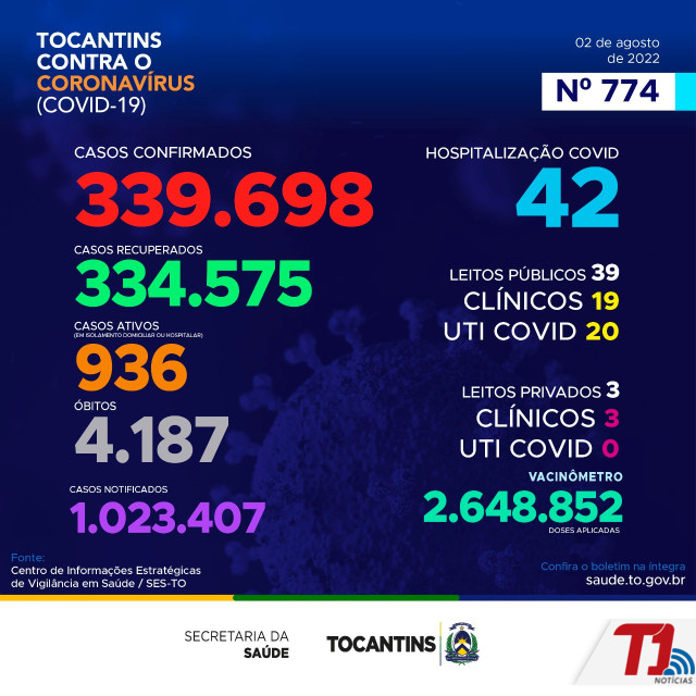 O boletim epidemiológico nº 774 informa que 42 pessoas estão hospitalizadas no Tocantins. Deste total, 39 estão em leitos públicos, sendo 19 em leitos clínicos e outros 20 em UTIs Covid. Já nos leitos privados, são 3 em clínicos e 0 em UTIs Covid, totalizando 3.