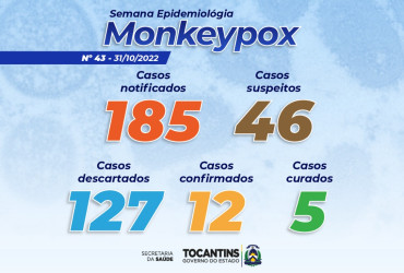 Nesta segunda-feira, 31, a Secretaria de Estado da Saúde (SES-TO) divulgou a atualização dos dados da Monkeypox no Tocantins. Abaixo está o levantamento do Centro de Informações Estratégicas de Vigilância em Saúde (CIEVS-TO), até 28 de setembro de 2022.