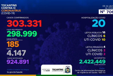 O boletim epidemiológico nº 706 informa que 20 pessoas estão hospitalizadas no Tocantins. Deste total, 16 estão em leitos públicos, sendo 6 em leitos clínicos e outros 10 em UTIs Covid. Já nos leitos privados, são 2 em clínicos e 2 em UTIs Covid, totalizando 4.