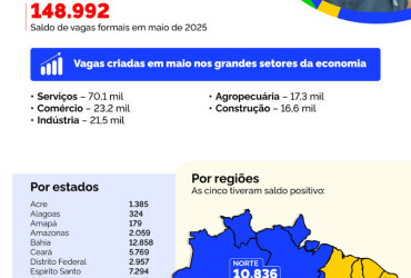No acumulado do ano, entre janeiro e maio de 2025, o Tocantins acumula 8,6 mil novos empregos formais. Nos últimos 12 meses, de junho de 2024 a maio de 2025, o saldo é de 10.650 vagas com carteira assinada.