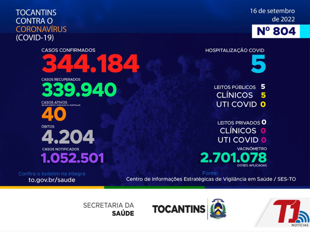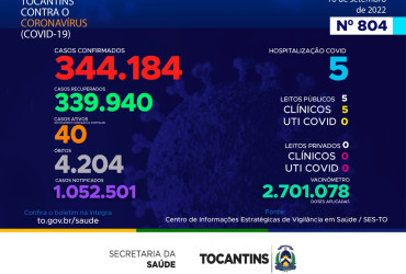 O boletim epidemiológico nº 804 informa que 5 pessoas estão hospitalizadas no Tocantins. Deste total, 5 estão em leitos públicos, sendo 5 em leitos clínicos e outros 0 em UTIs Covid. Já nos leitos privados, são 0 em clínicos e 0 em UTIs Covid.