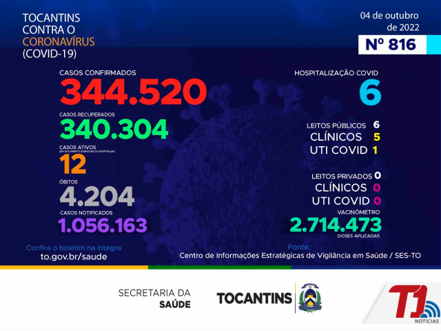O boletim epidemiológico nº 816 informa que 6 pessoas estão hospitalizadas no Tocantins. Deste total, 6 estão em leitos públicos, sendo 5 em leitos clínicos e outros 1 em UTIs Covid. Já nos leitos privados, são 0 em clínicos e 0 em UTIs Covid.