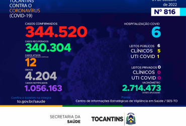 Com os novos dados, atualmente o Estado contabiliza 1.056.163 pessoas notificadas com a Covid-19 acumula 344.520 casos confirmados. Destes 340.304 estão recuperados, 15 pacientes seguem em isolamento domiciliar ou hospitalar e 4.204 foram a óbito.