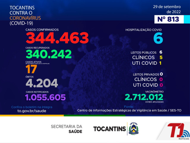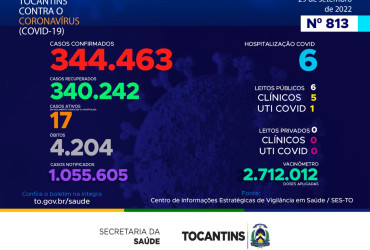 O boletim epidemiológico nº 813 informa que 6 pessoas estão hospitalizadas no Tocantins. Deste total, 6 estão em leitos públicos, sendo 5 em leitos clínicos e outros 1 em UTIs Covid. Já nos leitos privados, são 0 em clínicos e 0 em UTIs Covid.